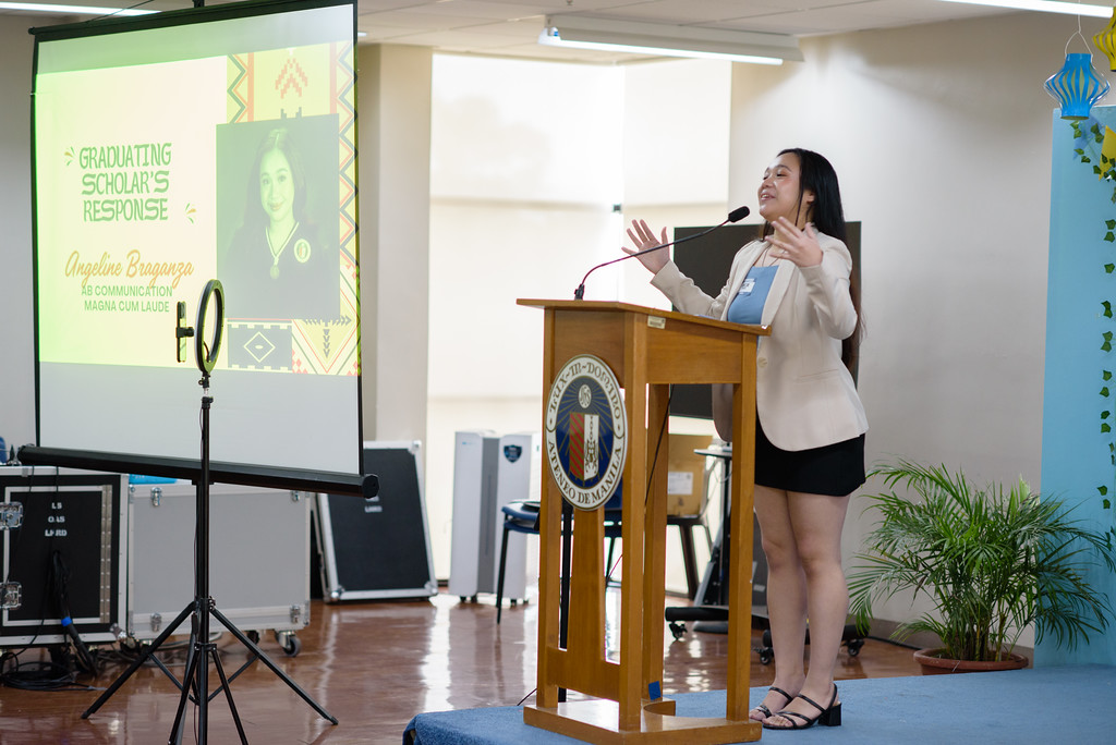 The Benefactor’s Speech was followed by a scholar’s response, delivered by Angeline Marie D. Braganza (4-AB Communication). Angel had her speech right after her own AASA benefactor, Mr. Sebastian. She shared about her unique journey from Bacolod to Ateneo, and emphasized the importance of taking chances and grabbing opportunities despite being scared and fearful about outcomes. Graduating as Magna Cum Laude is the evidence of her success as an AASA scholar! (Click here to see the Scholar’s Response)